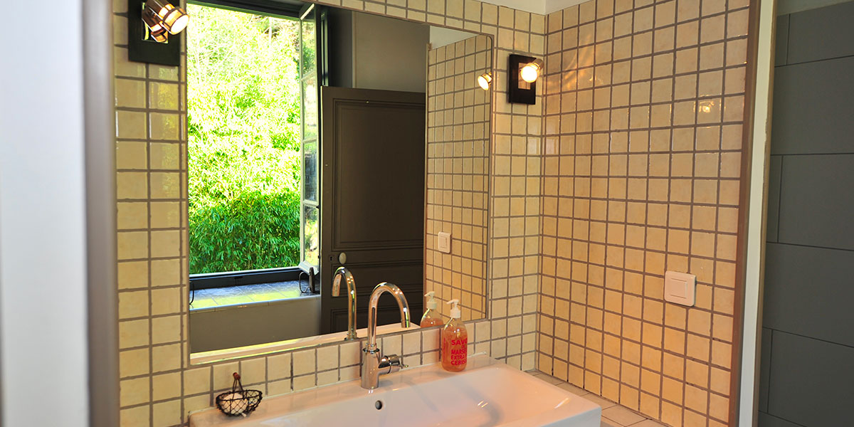 The room gives by its three windows, including that of its bathroom on the large waterfall, century-old gingko-bilobas, and, at the end of the summer, on a thick carpet of wild cyclamen.